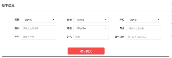 成功登录、确认参赛协议后,选手需填写国籍、省份、学校、院系、年级、专业、学号、姓名、姓名拼音等基本信息。