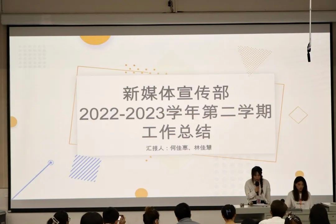 新媒体宣传部负责人首先对部门工作情况进行了总结,接着对本学期制作的海报、幕布和推送的文章进行了展示。最后,提出了工作展望,表示在接下来工作中会勇于创新,提高工作效率,加强各部门之间的联系。
