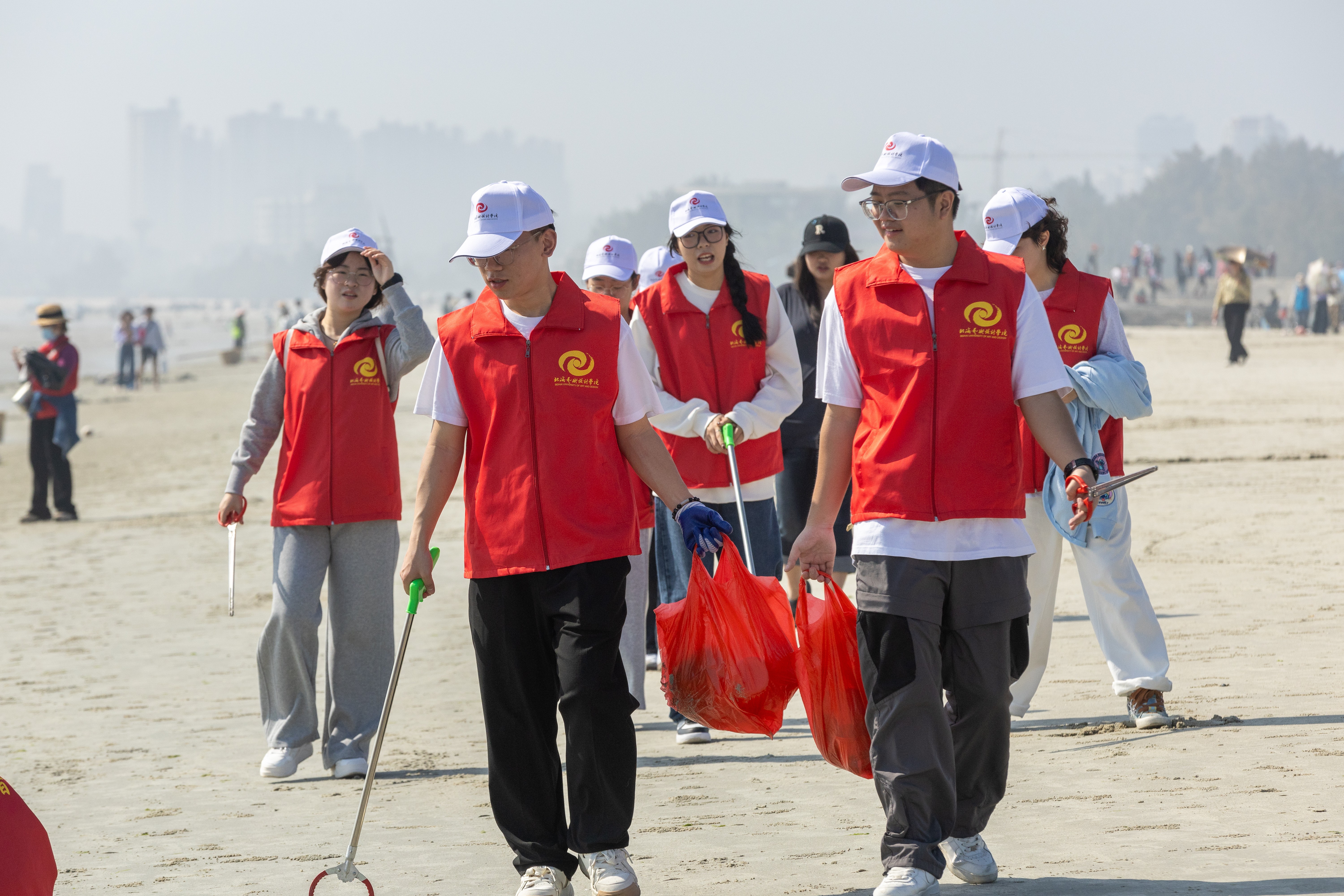 本次活动主办方设计了“分贝值比拼+净滩称重+朋友圈集赞”的积分规则,增添了活动趣味。我校志愿者身着红色志愿者马甲,手持垃圾袋和工具,认真清理沙滩上的烟头、塑料瓶、包装袋等垃圾,滩涂上的“志愿红”成为了一道靓丽的风景线。