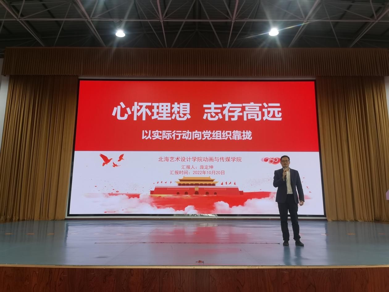 2022年10月10日、10月20日,北海艺术设计学院动画与传媒学院在西校区大礼堂开展了2022级动画与传媒学院新生关于入党的启蒙教育主题宣讲活动讲座。讲座由动画与传媒学院党总支副书记黄强红主持,分别由动画与传媒学院党总支书记孙永辉、动画与传媒学院党总支副书记庞定坤主讲。