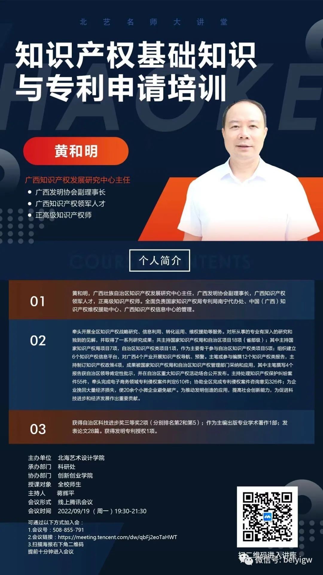 为进一步推动我校知识产权保护与专利申请工作有效开展,帮助我校师生提升专利挖掘能力,保护科技创新成果。9月19日,广西知识产权发展中心主任黄和明为全校师生开展题为《知识产权基础知识与专利申请培训》线上专题讲座。讲座由科研处副处长蒋辉平主持,近300名师生共同参与此次线上讲座。