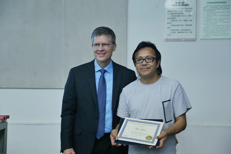 讲座开始前, Philip Reubin Johnso校长为我院副院长郑超、美术学院副院长成斌颁发了客座教授证书,并赠送了纪念礼物。随后讲座正式开始。首先Philip Reubin Johnso校长对我院的热情接待表示感谢,并高度赞扬我院是他个人心中在中国优秀的艺术设计类院校。