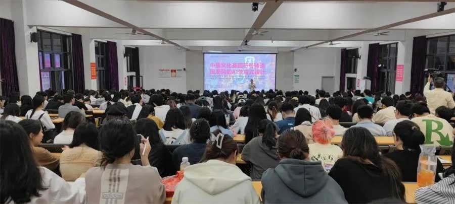 讲座伊始,范凯熹教授详细讲述了讲座课题的由来,并将其拆分为“何为国潮设计风”“何为中国文化基因符号”“如何通过AI生成式设计呈现”三个方面进行内容讲解。他阐述了国潮是将以中国传统文化基因为主进行的再创新、再发展,国潮流行的背后不仅是中国制造、中国品牌的崛起,更是中国情怀、中国自信的彰显,进而带领在场师生深入了解中国非物质文化遗产基因数据库的建设与特点。