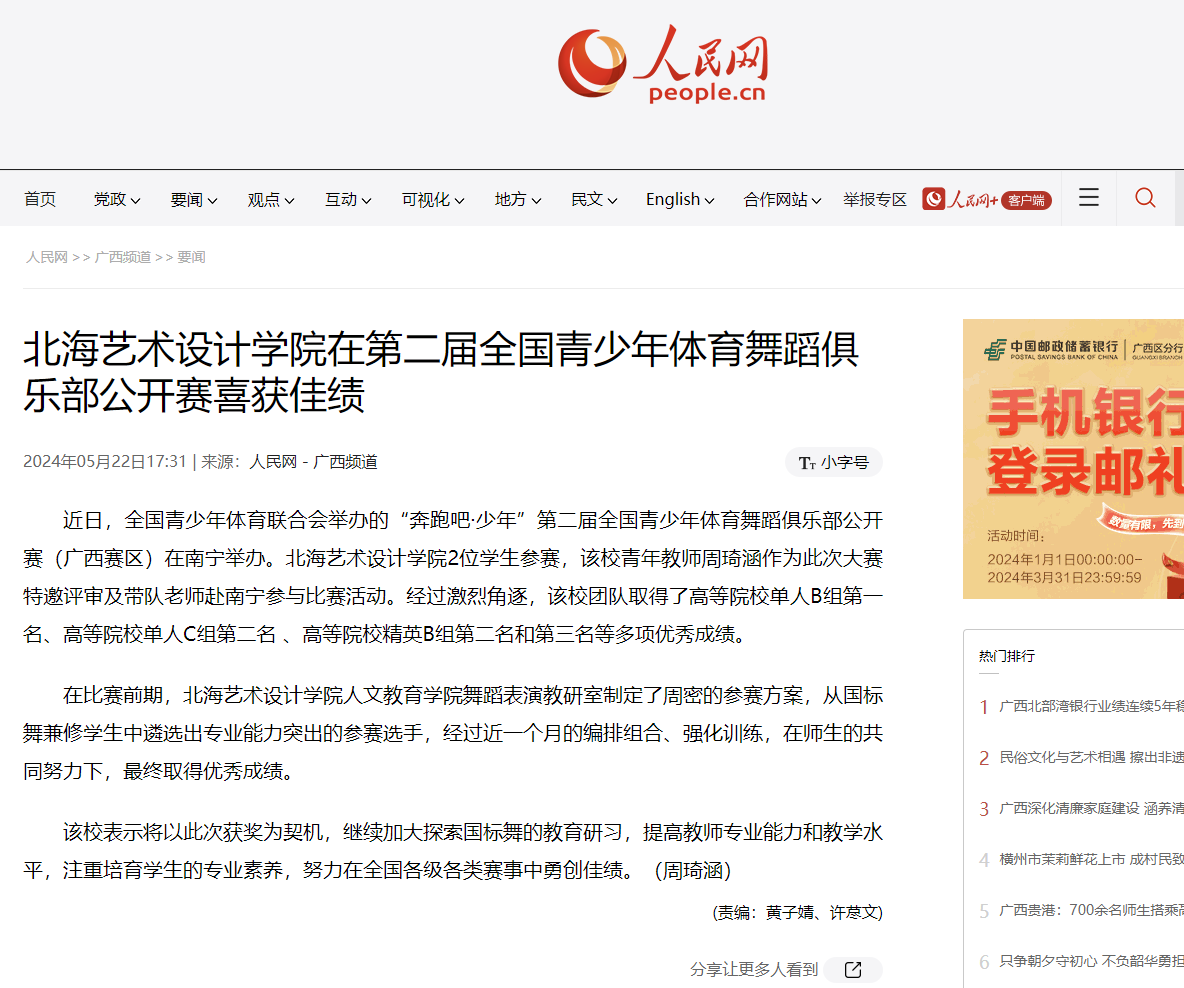 人民网:北海艺术设计学院在第二届全国青少年体育舞蹈俱乐部公开赛喜获佳绩