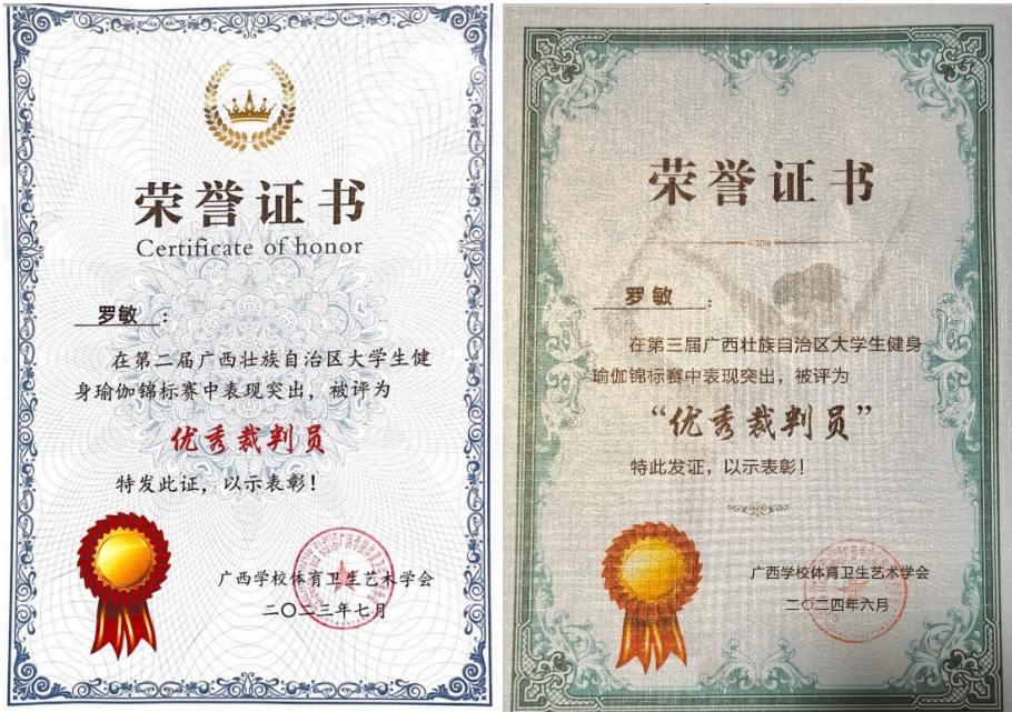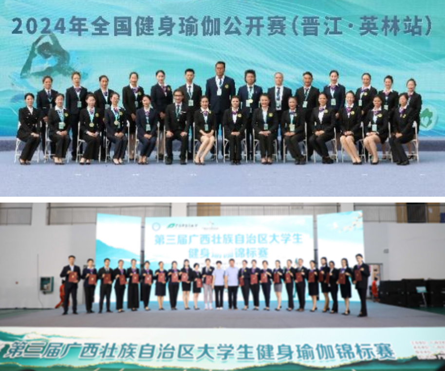 我校罗敏老师作为国家级健身瑜伽裁判员,积极参与了2024年全国健身瑜伽公开赛(晋江英林站)和广西壮族自治区大学生健身瑜伽锦标赛的裁判工作。