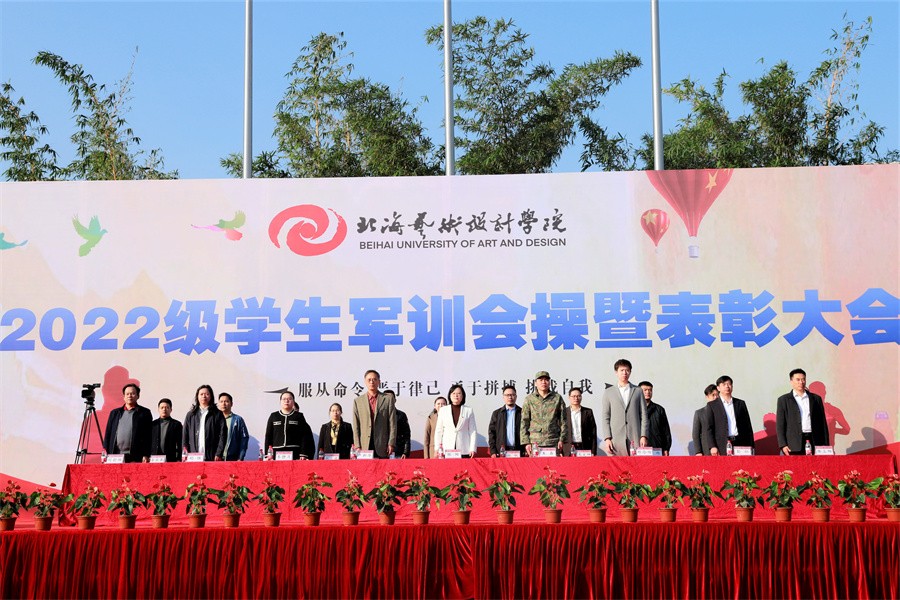 北海市海城区人民武装部政委王鑫在讲话中表示,此次军训时间安排紧、科目内容多、训练强度大,是一次体力与意志的较量、纪律与服从的检验。他对全体参训学生能够克服困难,出色完成所有军训任务的优良表现给予了高度评价和充分肯定。他强调,强国必须强军,军强才能国安,国防和军队建设,是国家安全发展的坚强后盾。近年来,北海艺术设计学院高度重视征兵工作,出台各种优待政策,鼓励学生积极报名参军,每年都有大批优秀学子走入军营,建设国防。他表示海城区征兵办作为学校学生应征入伍工作的办事机关,将继续竭诚为学校和广大学子做好应征入伍的各项工作。他呼吁我校广大学生在完成学业后,积极携笔从戎,参军入伍,为加强国防和军队现代化建设,实现建军一百年奋斗目标贡献力量。