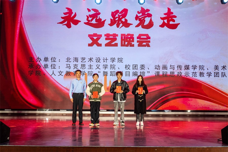 冬日的暖阳照耀北艺,和煦的暖风扬起旗帜。12月26日晚,我校在西校区大礼堂举办“永远跟党走”文艺晚会。晚会由北海艺术设计学院主办,马克思主义学院、校团委、动画与传媒学院、美术学院、人文教育学院“舞蹈剧目编排”课程思政示范教学团队联合承办。学校党委书记范徽忠,副校长陶立阳,马克思主义学院院长姜献生,校团委书记唐良春,人文教育学院党总支书记、院长熊秀峰等出席晚会。同时,本次晚会面向全体党员、发展对象和积极分子。