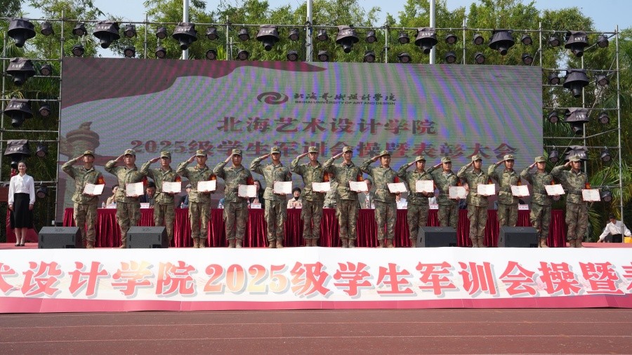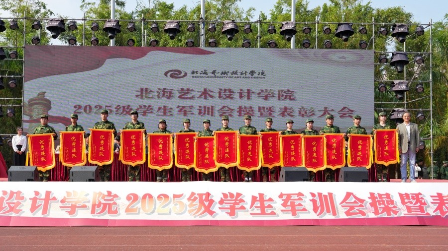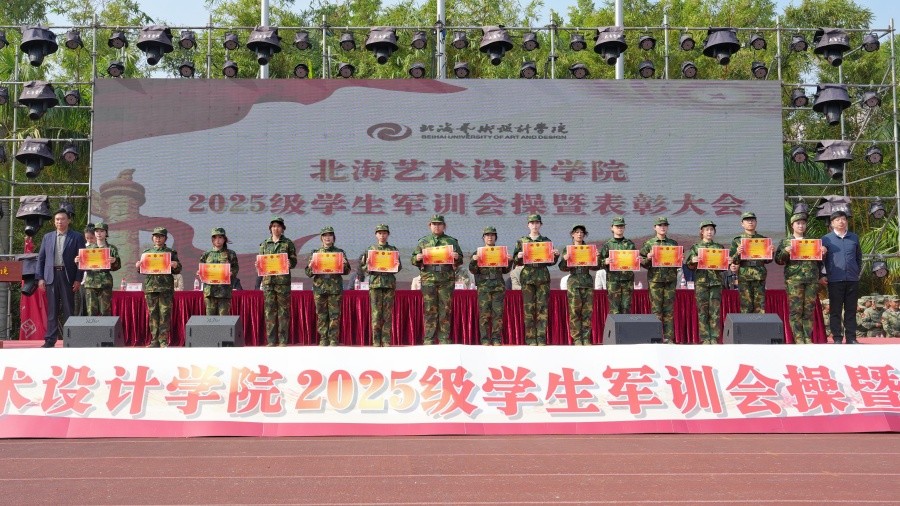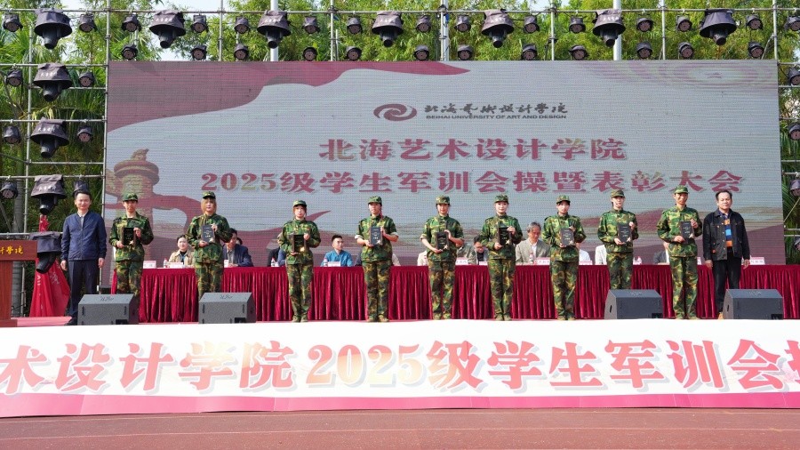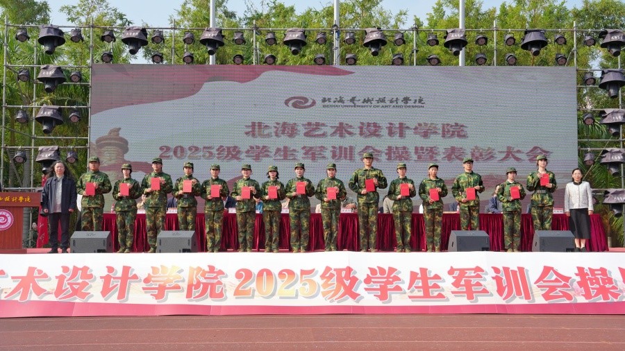 大会上,党委副书记陈毅华宣读了《北海艺术设计学院关于表彰2025级学生军训“优秀内务宿舍”“优秀标兵”“优秀教官”“优秀连队”的决定》,向军训中的优秀个人、先进集体和在军训期间合唱比赛中获奖的连队进行表彰,并由现场领导依次颁发荣誉证书和锦旗。(周小琪、郭松、大学生记者团摄影部/摄)