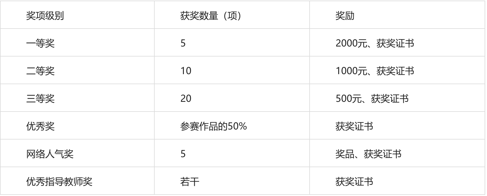 (三)终评:邀请校内、外不同领域专家组成评审团,在优秀作品中评选出一等奖5项、二等奖10项、三等奖20项。