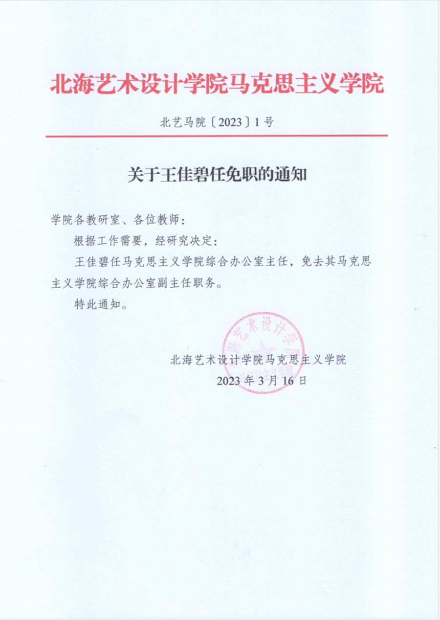 北艺马院〔2023〕1号 关于王佳碧任免职的通知