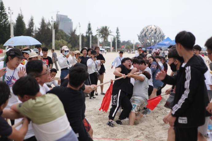 开幕式结束后,赛场上开始了激烈的角逐。本次运动会分为八人九足、水到渠成、高跷接力、拔河、沙滩排球和沙雕比赛六个项目,运动员们用坚持和毅力向我们展示了他们对运动热爱;拉拉队员用他们的声线为队员们喝彩;工作人员们更是忠于职守、用自己的努力为大家提供了保障。