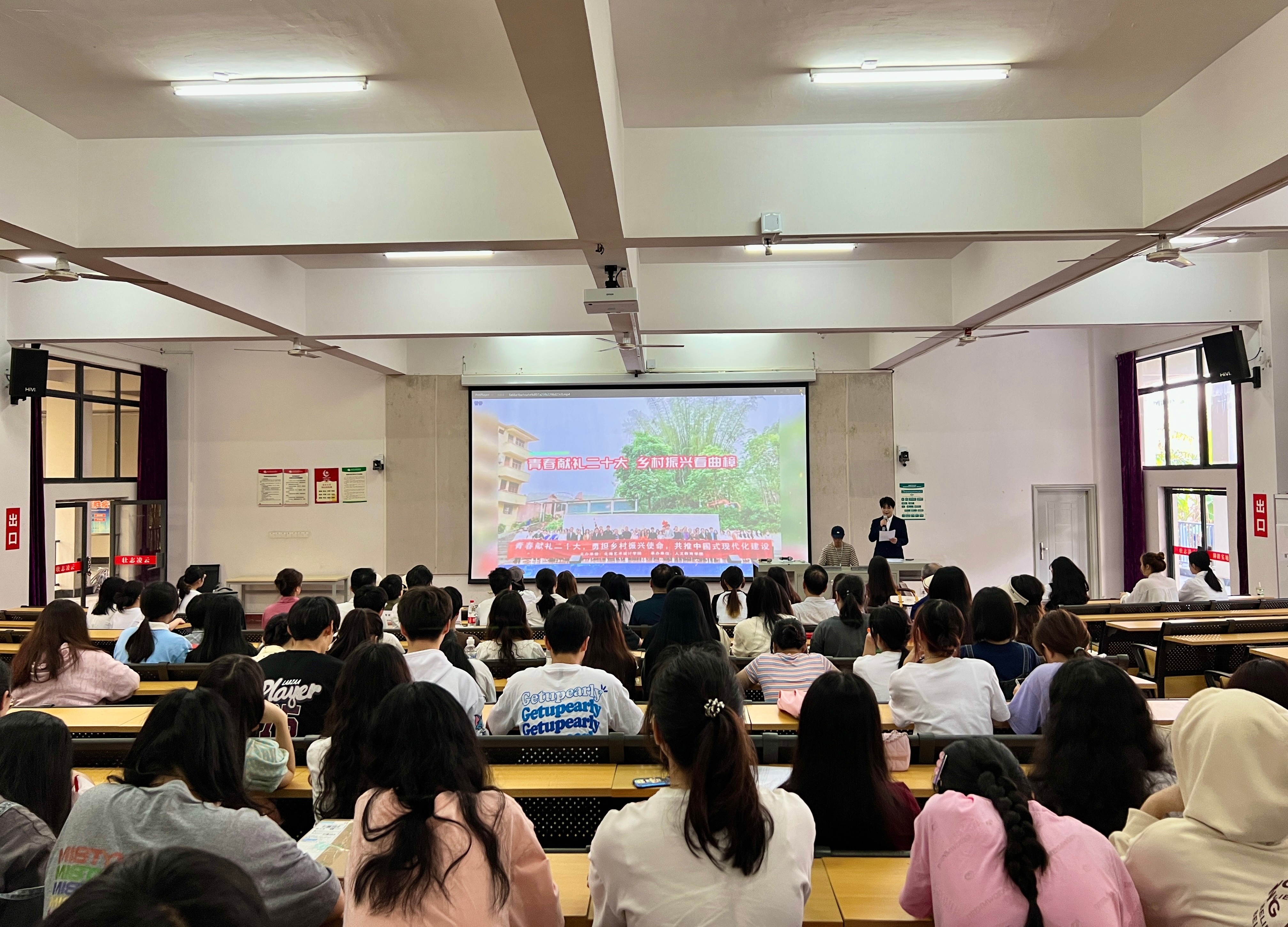 在主持人的带领下,参会师生观看了我院各教研室代表教师与学生在曲樟乡开展产学研活动的视频,视频展现了我校贯彻党的二十大精神,为乡村振兴事业注入新的希望和新的活力。