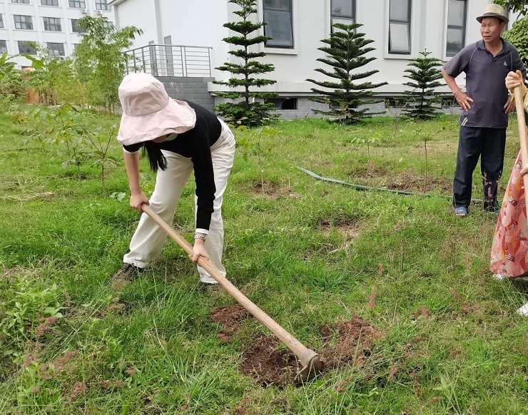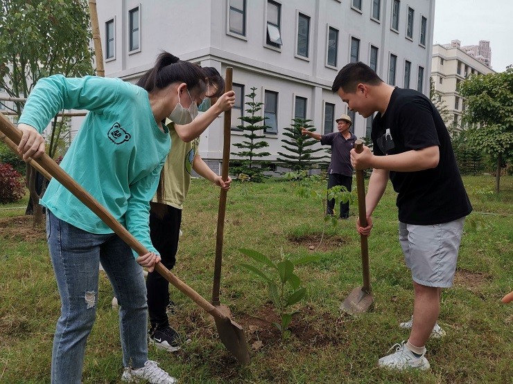 来到空地上大家一片忙碌!刨开梦想的土,挖开希望的坑,种下一颗美好的树苗,孕育未来的精彩。绿化冯师傅亲自指导。严格的指导大家掌握好树坑的尺度,培土施肥的方法,最后还不忙提醒大家浇水要浇透,每天都要浇水。