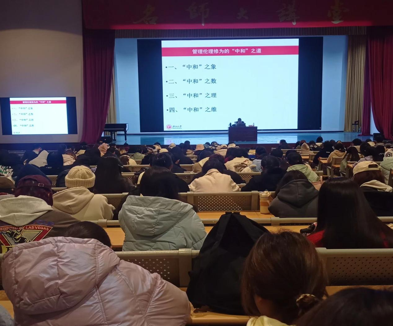 12月18日晚,广西大学公共管理学院王玉生教授应邀于我校西校区大礼堂,为广大师生带来了一场题为《管理伦理修为中的“中和”之道》的精彩讲座。讲座旨在分享管理中的“中和”哲学思想以及人生需要掌握的协调平衡思维。讲座由院长蒙绍荣教授主持。