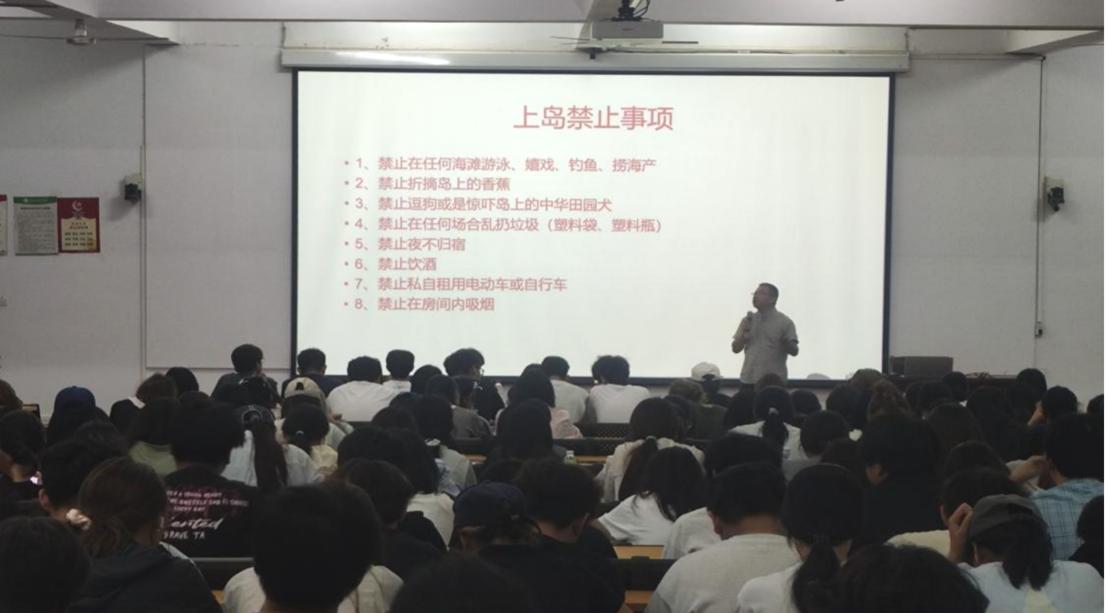 动员会讲解了涠洲岛写生事宜,包括行程安排、岛屿概况、安全规范及教学任务等内容。龚院长着重强调了安全规范及教学任务两方面。学生应爱护岛上动植物,禁止如下海游泳、私自捕捞海产等危险行为,在住宿点和景点注意文明礼貌;在完成色彩风景写生、速写及实习报告等学习任务的同时,鼓励学生参加手机摄影大赛,丰富学习体验,提升综合素质。最后赏析了一些展现涠洲岛风光的名家画作及往年优秀学生作品,至此,动员会圆满结束。(林昌华 马圣翔 摄)
