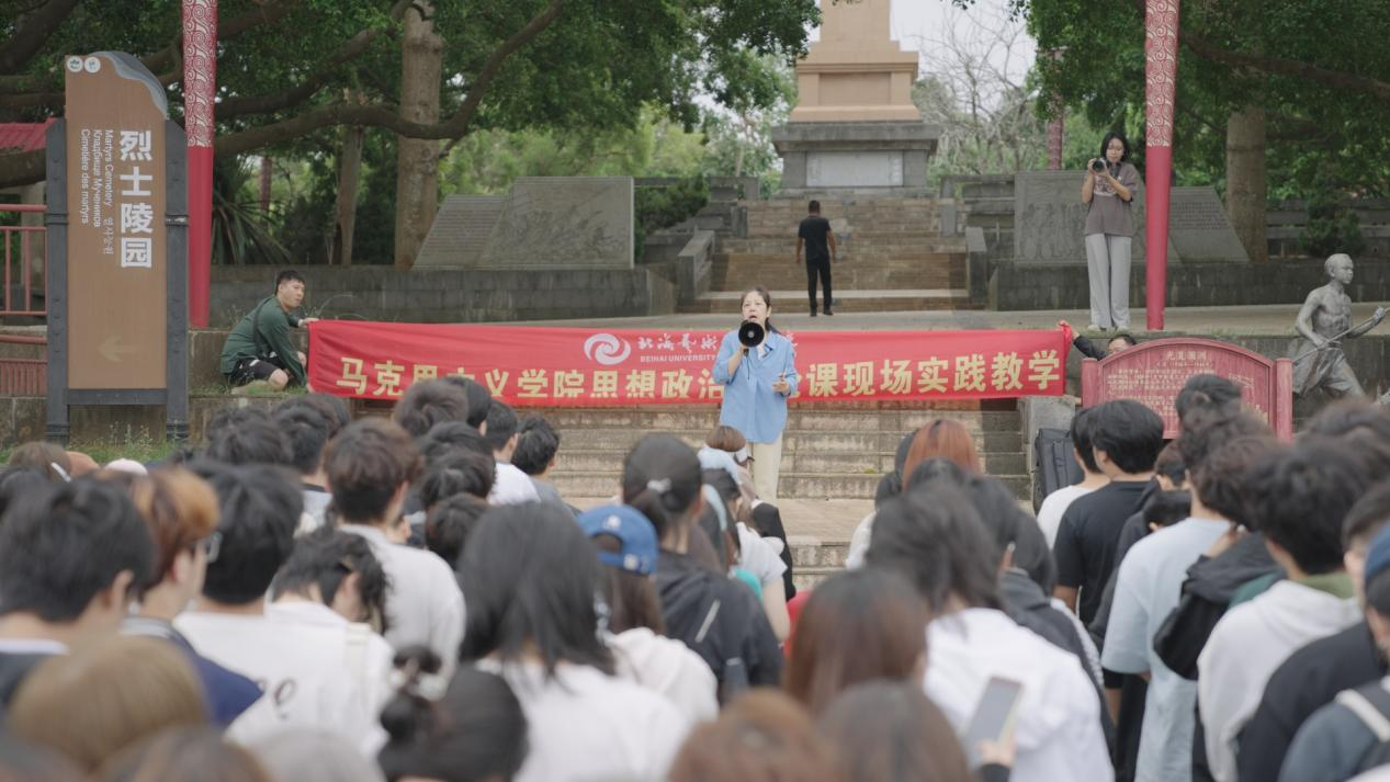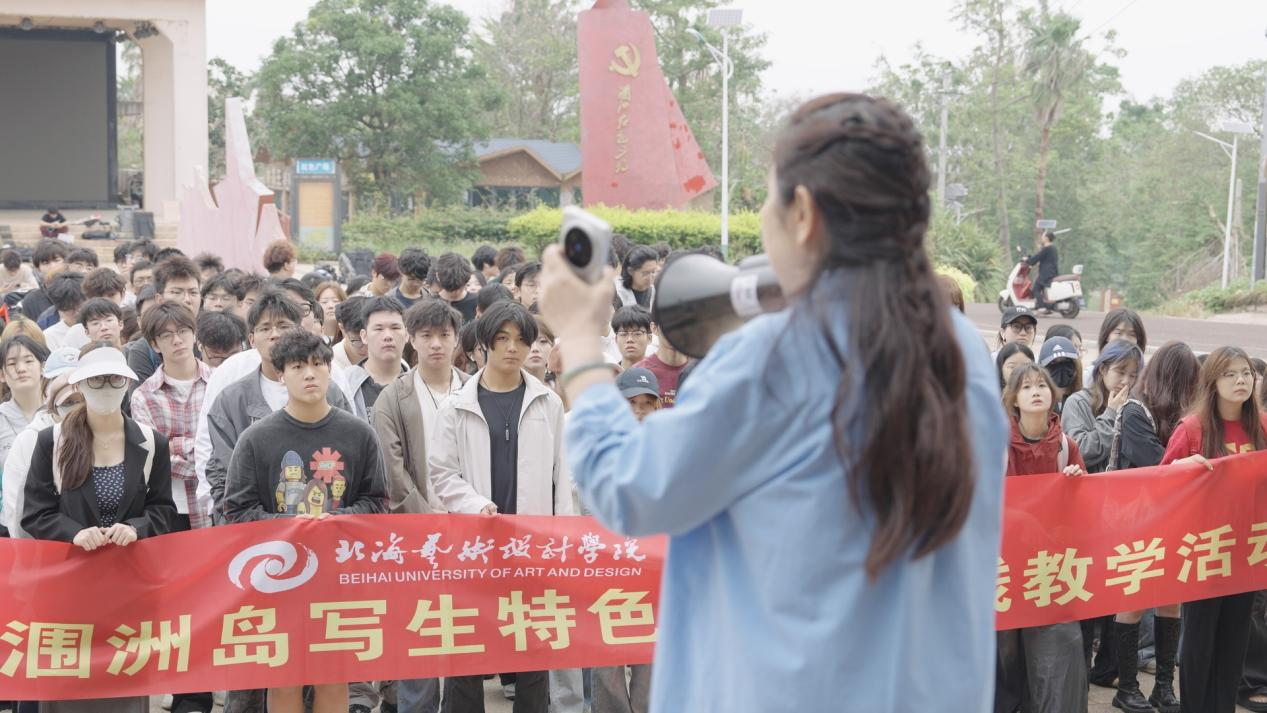 值得一提的是,此次实践始终以“思政引领”为核心抓手,将专业创作与价值塑造深度融合。学院党总支精心策划“以青春之志缅先烈,用数字之笔担使命”主题党日活动,特邀马克思主义学院黎晓岚教授在红色广场开设现场思政课。黎教授结合涠洲岛海防历史讲述先辈奋斗故事,学生们认真聆听、踊跃互动,深入探讨了艺术应该如何承载红色记忆等话题。课后,大家瞻仰红色雕塑、敬献鲜花,并围绕“讲好红色故事”展开研讨。此外,学生们还自发开展了“海岛清洁卫士”志愿服务,并通过“创意接龙”“声音剧场”等团建活动凝聚团队力量,切实强化了社会责任意识,深化了红色传承思想。