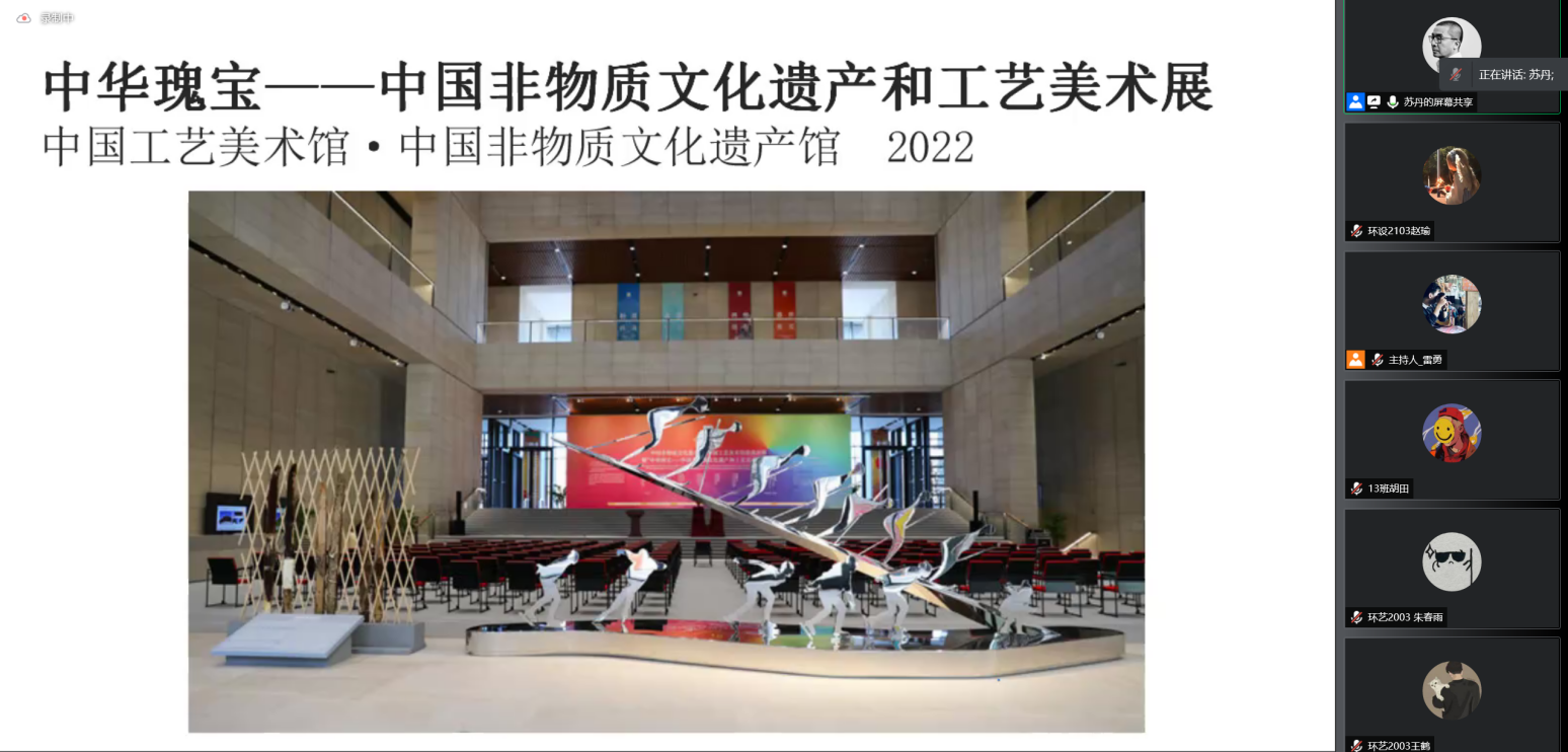 展览促进艺术构成,激励艺术生活,推动艺术创作。2022年5月29日,建筑与环境艺术学院承办的《艺术的展览与展览的艺术》主题讲座于线上顺利开讲。本次讲座诚挚邀请到中国工艺美术馆、中国非物质文化遗产馆副馆长、清华大学美术学院教授、博士生导师、中国美术家协会环境设计艺术委员会主任、中国建筑学会室内设计分会理事长苏丹主讲。