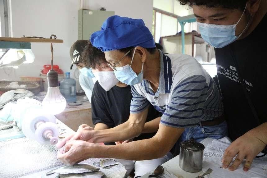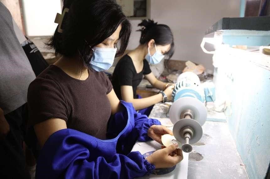 我校雕塑专业2022届毕业生为同学们示范贝雕打磨切割技法