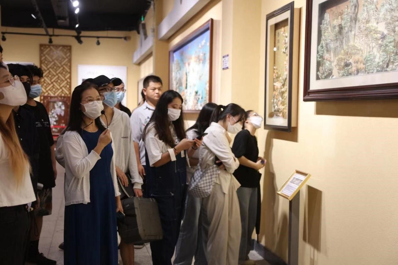 参观期间,李艾玲老师对贝雕历史与作品为同学们进行细致入微地讲解。李艾玲老师同时提到切实落实传承与创新对弘扬中国传统文化具有重要推动作用,而独具地域特色的北海贝雕的历史悠久,不仅承载着古老的海洋文化、体现着现代文明,更是北海的城市“名片”。在这里同学们观摩了民间非物质文化遗产北海贝雕传人的精湛技艺,了解了以贝币、贝壳等种类贝雕的相关历史沿革与文化知识,欣赏了历年获奖的优秀贝雕艺术作品,学习体验了北海贝雕繁复工艺中的车磨、抛光、粘贴等独特技法。
