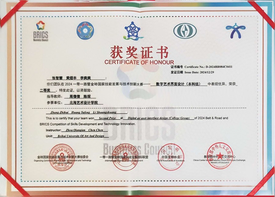 据悉,一带一路暨金砖国家技能发展与技术创新大赛是教育部官方认证的国家级A类学科竞赛。本届赛事——数字艺术界面设计赛项旨在响应《国家“十四五”数字经济发展规划》及“一带一路”倡议,深化产教融合,推动人工智能与艺术设计的跨界创新,共吸引了全球200余所高校、超千名选手同台竞技。我校设计艺术学院师生凭借前沿技术应用与创新设计思维脱颖而出,展现了学院在AI时代“数智化转型”的教学成效。