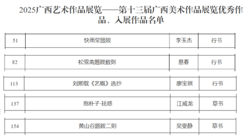 近日,由广西壮族自治区人民政府主办的2025广西艺术作品展览——第十三届广西书法(篆刻)作品展览评选结果揭晓。我校书法学院成绩斐然,4位教师及1位2023级学生的作品成功入展。