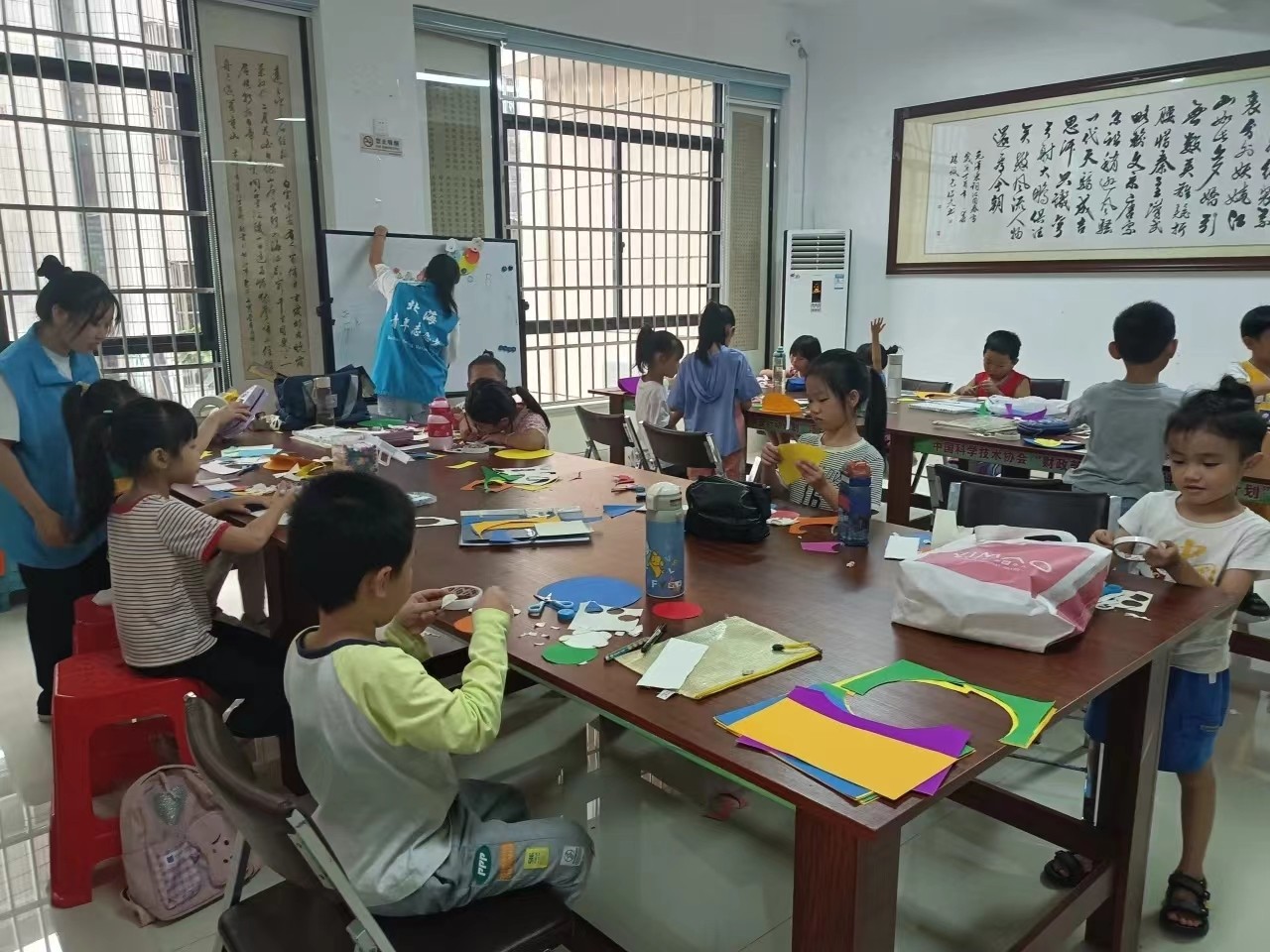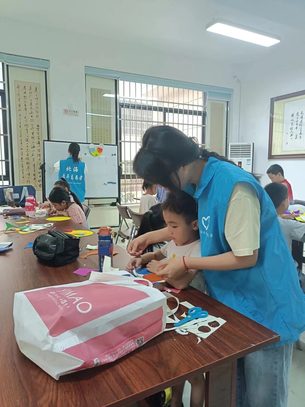 上课啦!孩子们如同初升的朝阳,朝气蓬勃。志愿者们也充当好老师的角色,为课上的孩子们认 真讲课,仿佛浇灌花朵的园丁,殷切地将画画手工知识教给小朋友们,给小朋友带去了无穷的乐趣。随着课程的不断进展,志愿者们细心地辅导着小朋友们,认真解答他们的问题,一次次落下的画笔是小朋友们天马行空的想象,是他们对于这个世界的探索,也是他们初识人生的一步。